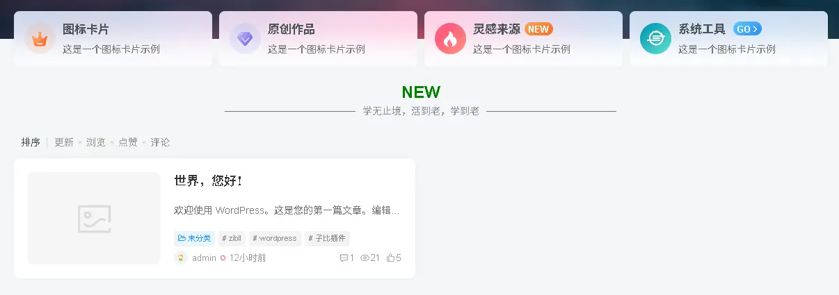 写了一个简约的样式的文章,今天跟之前的一样,不过今天是动态的NEW居中样式,这款样式看上去很舒服,刷新会有动态,喜欢的自行部署吧!